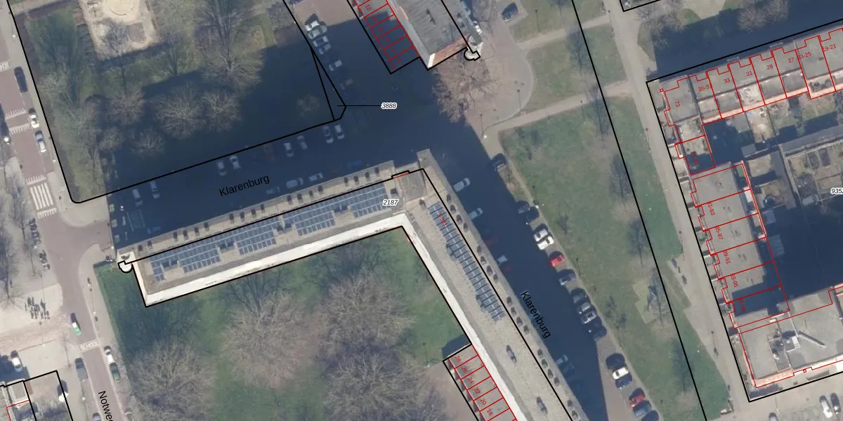 Het perceel waarop Klarenburg 21 staat heeft een oppervlakte van 2034 m². Dit is een zeer groot perceel. De perceeloppervlakte wordt geregistreerd door het Kadaster. Gedetailleerde informatie over de maten van dit perceel kunt u vinden in het rapport Kadastrale kaart met maatvoering van Klarenburg 21.
