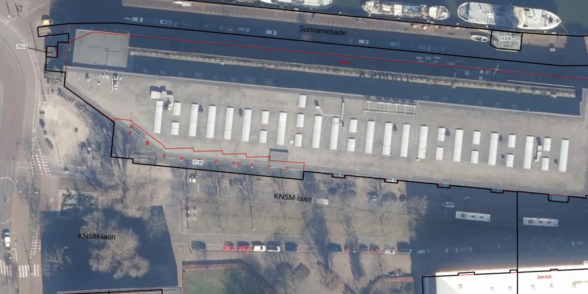 Het perceel waarop KNSM-laan 107 staat heeft een oppervlakte van 8065 m². Dit is een zeer groot perceel. De perceeloppervlakte wordt geregistreerd door het Kadaster. Gedetailleerde informatie over de maten van dit perceel kunt u vinden in het rapport Kadastrale kaart met maatvoering van KNSM-laan 107.
