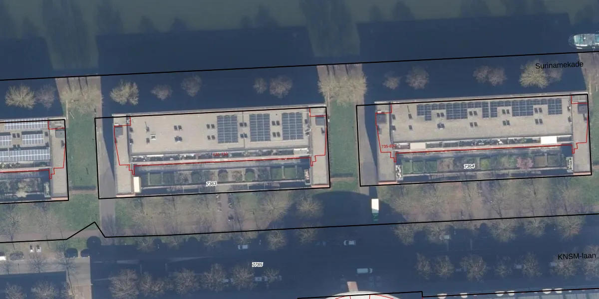 Het perceel waarop KNSM-laan 727 staat heeft een oppervlakte van 2086 m². Dit is een zeer groot perceel. De perceeloppervlakte wordt geregistreerd door het Kadaster. Gedetailleerde informatie over de maten van dit perceel kunt u vinden in het rapport Kadastrale kaart met maatvoering van KNSM-laan 727.