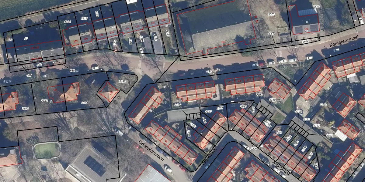 Het perceel waarop Kometensingel 165 staat heeft een oppervlakte van 5427 m². Dit is een zeer groot perceel. De perceeloppervlakte wordt geregistreerd door het Kadaster. Gedetailleerde informatie over de maten van dit perceel kunt u vinden in het rapport Kadastrale kaart met maatvoering van Kometensingel 165.
