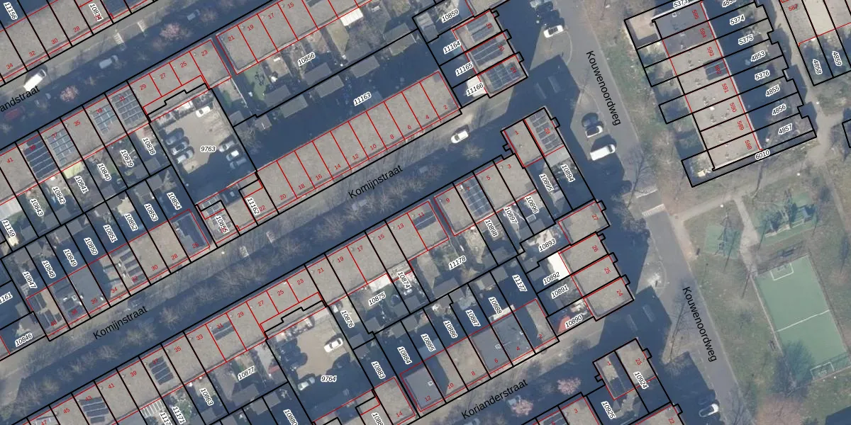 Het perceel waarop Komijnstraat 11 staat heeft een oppervlakte van 409 m². Dit is een groot perceel. De perceeloppervlakte wordt geregistreerd door het Kadaster. Gedetailleerde informatie over de maten van dit perceel kunt u vinden in het rapport Kadastrale kaart met maatvoering van Komijnstraat 11.