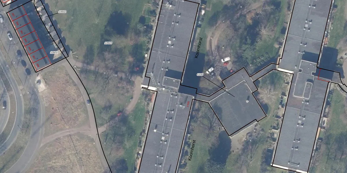 Het perceel waarop Koornhorst 325 staat heeft een oppervlakte van 5615 m². Dit is een zeer groot perceel. De perceeloppervlakte wordt geregistreerd door het Kadaster. Gedetailleerde informatie over de maten van dit perceel kunt u vinden in het rapport Kadastrale kaart met maatvoering van Koornhorst 325.
