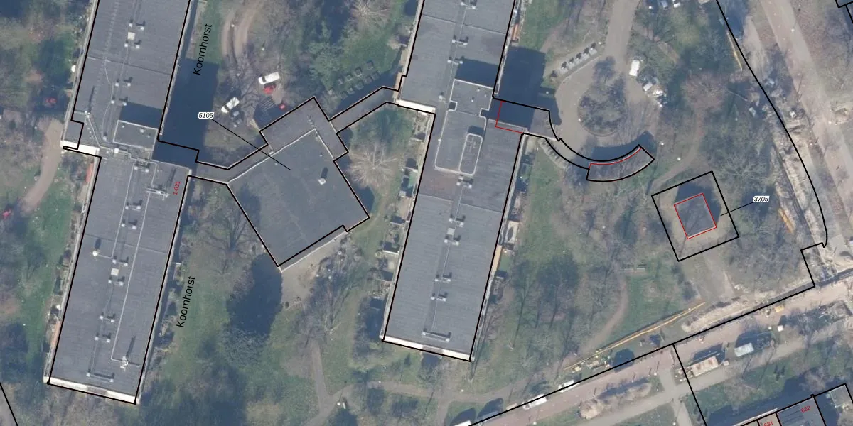 Het perceel waarop Koornhorst 41 staat heeft een oppervlakte van 5615 m². Dit is een zeer groot perceel. De perceeloppervlakte wordt geregistreerd door het Kadaster. Gedetailleerde informatie over de maten van dit perceel kunt u vinden in het rapport Kadastrale kaart met maatvoering van Koornhorst 41.