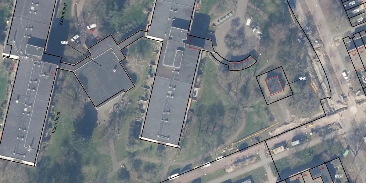 Het perceel waarop Koornhorst 42 staat heeft een oppervlakte van 5615 m². Dit is een zeer groot perceel. De perceeloppervlakte wordt geregistreerd door het Kadaster. Gedetailleerde informatie over de maten van dit perceel kunt u vinden in het rapport Kadastrale kaart met maatvoering van Koornhorst 42.