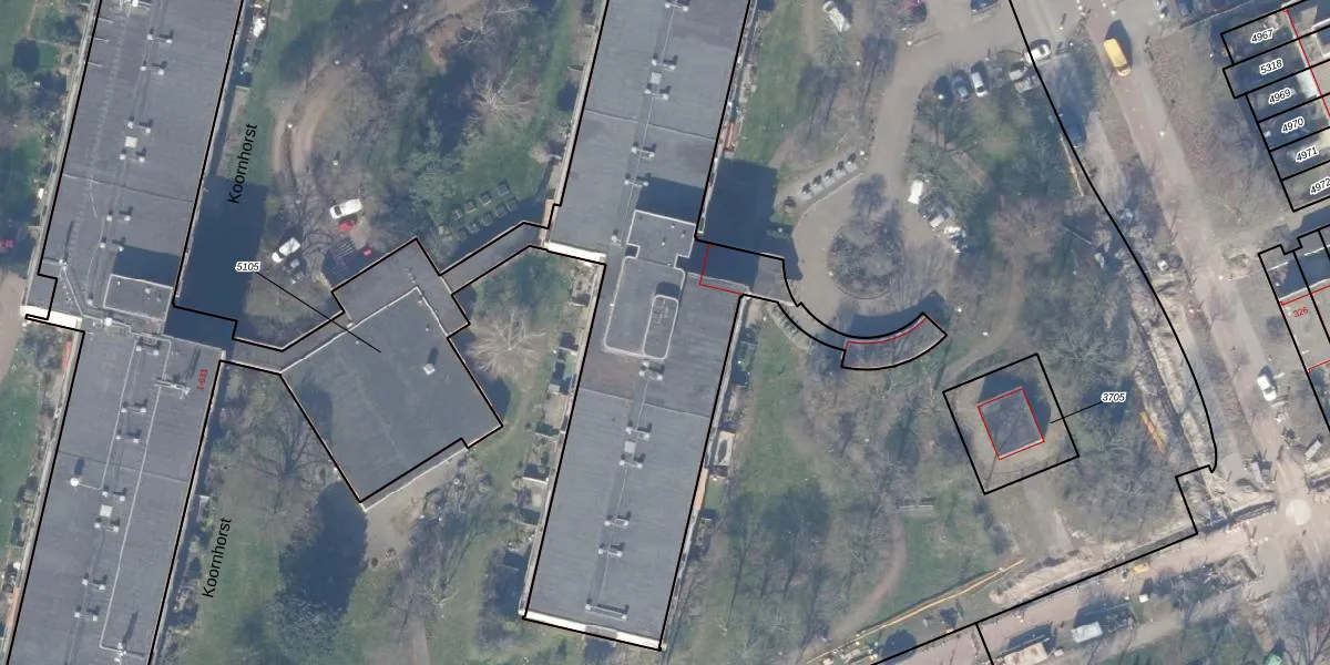Het perceel waarop Koornhorst 433 staat heeft een oppervlakte van 5615 m². Dit is een zeer groot perceel. De perceeloppervlakte wordt geregistreerd door het Kadaster. Gedetailleerde informatie over de maten van dit perceel kunt u vinden in het rapport Kadastrale kaart met maatvoering van Koornhorst 433.
