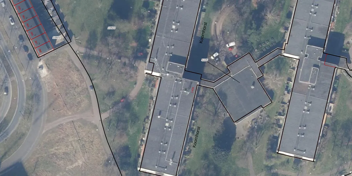 Het perceel waarop Koornhorst 502 staat heeft een oppervlakte van 5615 m². Dit is een zeer groot perceel. De perceeloppervlakte wordt geregistreerd door het Kadaster. Gedetailleerde informatie over de maten van dit perceel kunt u vinden in het rapport Kadastrale kaart met maatvoering van Koornhorst 502.