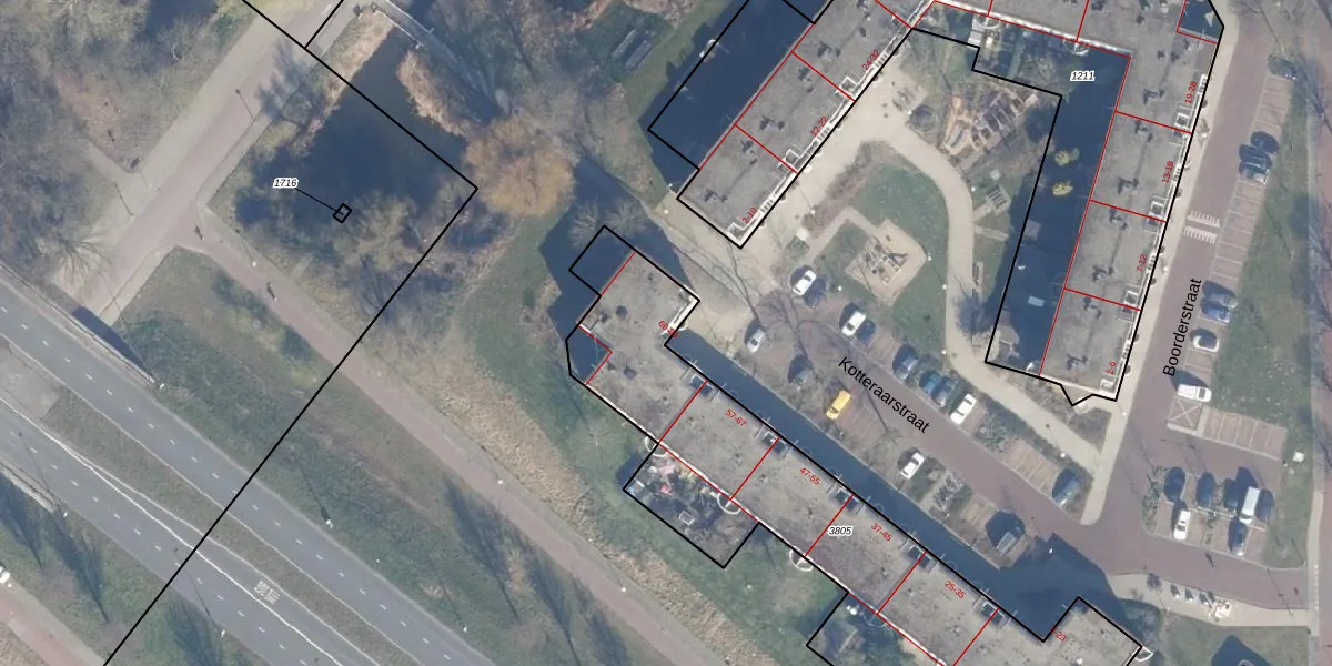 Het perceel waarop Kotteraarstraat 83 staat heeft een oppervlakte van 1870 m². Dit is een zeer groot perceel. De perceeloppervlakte wordt geregistreerd door het Kadaster. Gedetailleerde informatie over de maten van dit perceel kunt u vinden in het rapport Kadastrale kaart met maatvoering van Kotteraarstraat 83.