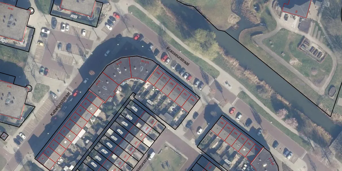 Het perceel waarop Krasseurstraat 255 staat heeft een oppervlakte van 2551 m². Dit is een zeer groot perceel. De perceeloppervlakte wordt geregistreerd door het Kadaster. Gedetailleerde informatie over de maten van dit perceel kunt u vinden in het rapport Kadastrale kaart met maatvoering van Krasseurstraat 255.