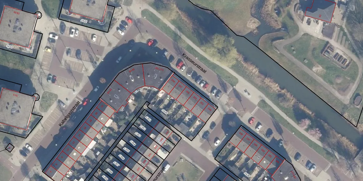 Het perceel waarop Krasseurstraat 257 staat heeft een oppervlakte van 2551 m². Dit is een zeer groot perceel. De perceeloppervlakte wordt geregistreerd door het Kadaster. Gedetailleerde informatie over de maten van dit perceel kunt u vinden in het rapport Kadastrale kaart met maatvoering van Krasseurstraat 257.