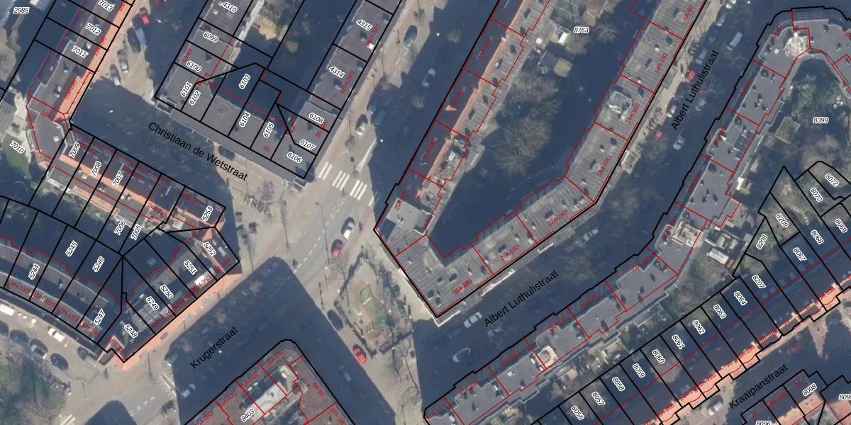 Het perceel waarop Krugerstraat 25-C staat heeft een oppervlakte van 3607 m². Dit is een zeer groot perceel. De perceeloppervlakte wordt geregistreerd door het Kadaster. Gedetailleerde informatie over de maten van dit perceel kunt u vinden in het rapport Kadastrale kaart met maatvoering van Krugerstraat 25-C.