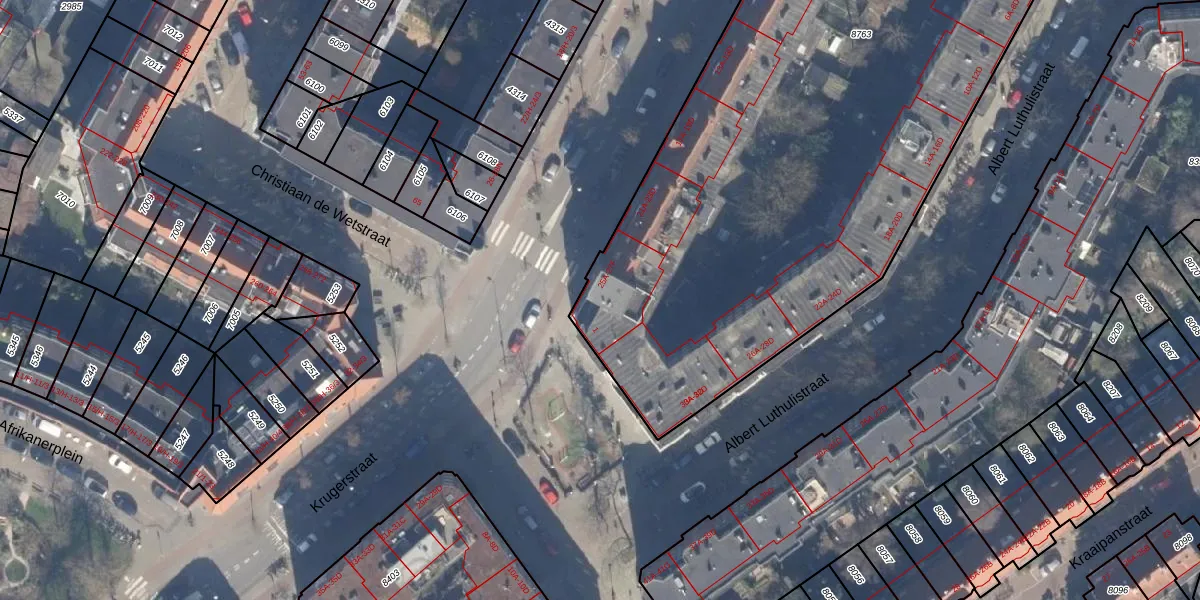 Het perceel waarop Krugerstraat 27-B staat heeft een oppervlakte van 3607 m². Dit is een zeer groot perceel. De perceeloppervlakte wordt geregistreerd door het Kadaster. Gedetailleerde informatie over de maten van dit perceel kunt u vinden in het rapport Kadastrale kaart met maatvoering van Krugerstraat 27-B.