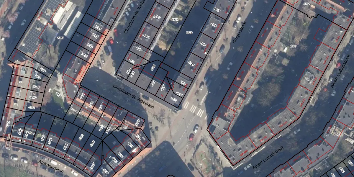 Het perceel waarop Krugerstraat 28-C staat heeft een oppervlakte van 65 m². Dit is een klein perceel. De perceeloppervlakte wordt geregistreerd door het Kadaster. Gedetailleerde informatie over de maten van dit perceel kunt u vinden in het rapport Kadastrale kaart met maatvoering van Krugerstraat 28-C.
