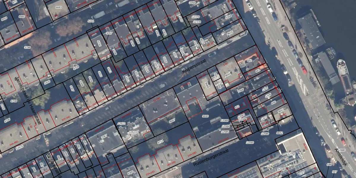 Het adres is gelegen op perceel 9690 in de sectie V en de kadastrale gemeente Amsterdam. De kadastrale aanduiding is aldus ASD18-V-9690. De gemiddelde perceeloppervlakte in de kadastrale gemeente Amsterdam is 558,8 m². Dit perceel is met zijn 790 m² dus groter dan gemiddeld. De grootste perceeloppervlakte in de kadastrale gemeente is 12,5 ha. De kleinste oppervlakte bedraagt 0 m². Op het perceel liggen in totaal 17 adressen. De huidige grenzen van het perceel zijn digitaal in de Basisregistratie Kadaster (BRK) geregistreerd op 03-12-2013.