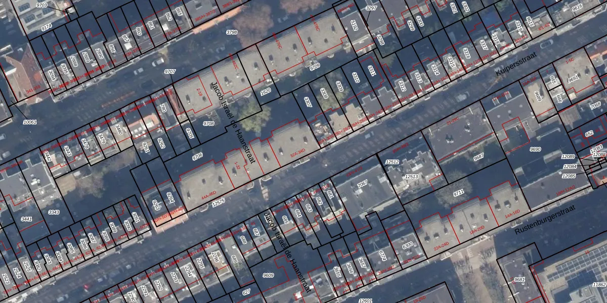 Het adres ligt op het perceel ASD18-V-9706, dat zich in de kadastrale gemeente Amsterdam bevindt. De oppervlakte van het perceel is 934 m². Dat is groter dan gemiddeld in Amsterdam, waar de gemiddelde perceeloppervlakte op 558,8 m² ligt. De grootste perceeloppervlakte in de kadastrale gemeente is 12,5 ha. De kleinste oppervlakte bedraagt 0 m². Op het perceel zijn 22 adressen aanwezig. De huidige grenzen van het perceel zijn digitaal in de Basisregistratie Kadaster (BRK) geregistreerd op 17-10-2006.