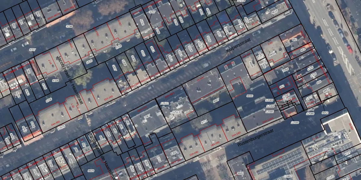 Het adres is gelegen op perceel 12513 in de sectie V en de kadastrale gemeente Amsterdam. De kadastrale aanduiding is aldus ASD18-V-12513. Het perceel is kleiner dan gemiddeld in Amsterdam. Het perceel is 332 m² groot, terwijl het gemiddelde ligt op 558,8 m². De grootste perceeloppervlakte in de kadastrale gemeente is 12,5 ha. De kleinste oppervlakte bedraagt 0 m². Er zijn 16 adressen aanwezig op het perceel. De huidige grenzen van het perceel zijn digitaal in de Basisregistratie Kadaster (BRK) geregistreerd op 07-11-2017.