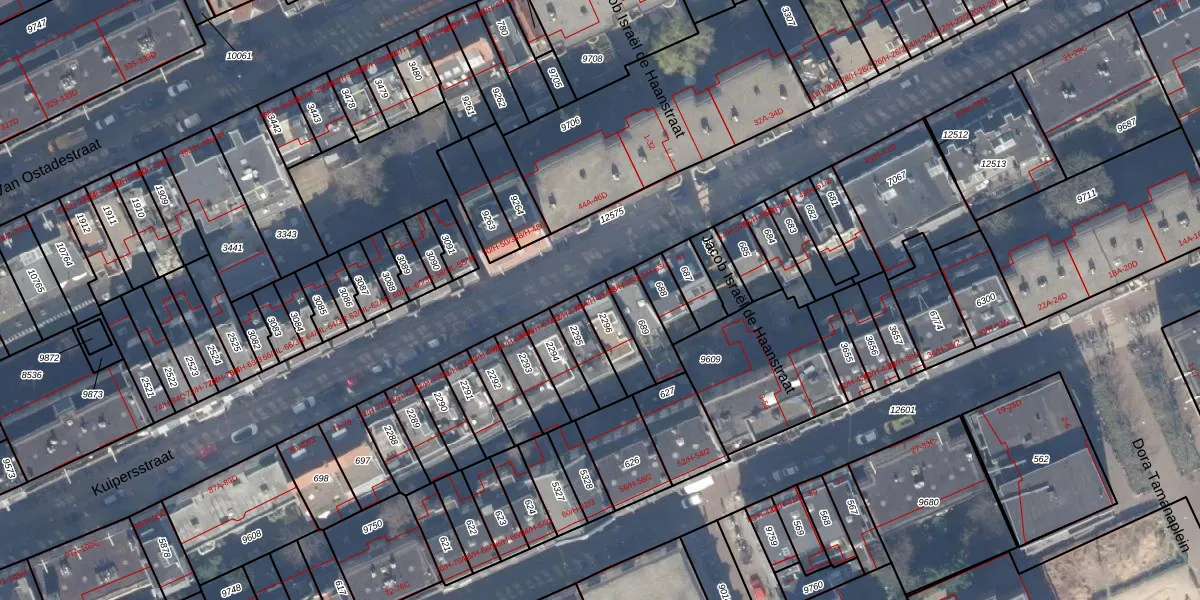 Het adres is gelegen op perceel 2296 in de sectie V en de kadastrale gemeente Amsterdam. De kadastrale aanduiding is aldus ASD18-V-2296. Het perceel is kleiner dan gemiddeld in Amsterdam. Het perceel is 101 m² groot, terwijl het gemiddelde ligt op 558,8 m². Het grootste perceel in de kadastrale gemeente is 12,5 ha. Het kleinste perceel heeft een oppervlakte van 0 m². Op het perceel liggen in totaal 4 adressen. De huidige grenzen van het perceel zijn digitaal in de Basisregistratie Kadaster (BRK) geregistreerd op 17-10-2006.