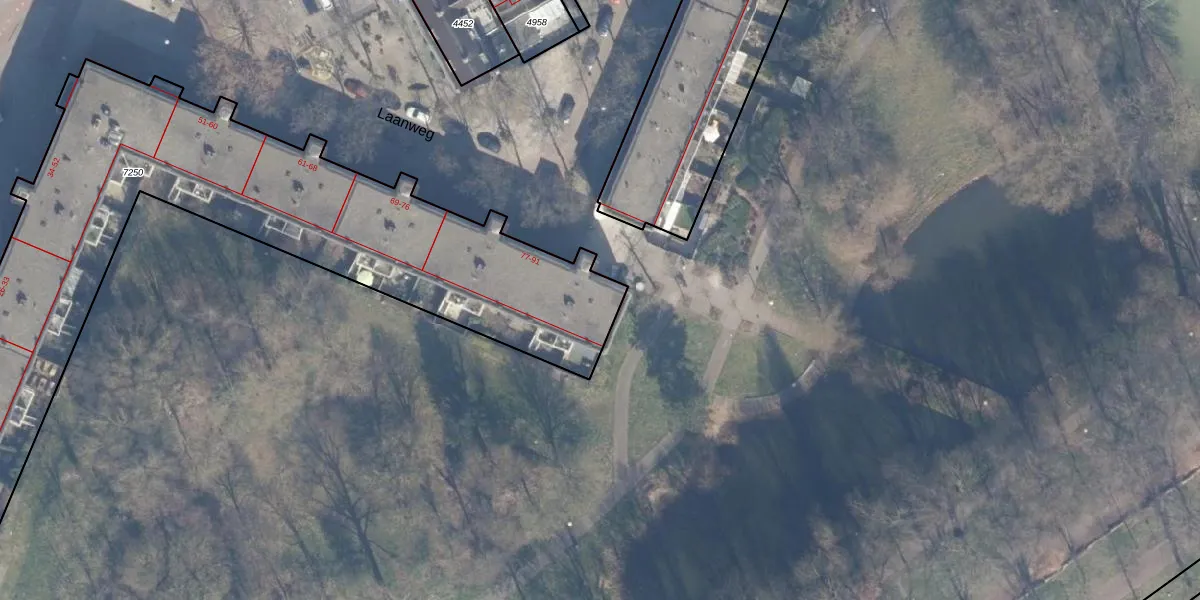 Het perceel waarop Laanweg 90 staat heeft een oppervlakte van 3110 m². Dit is een zeer groot perceel. De perceeloppervlakte wordt geregistreerd door het Kadaster. Gedetailleerde informatie over de maten van dit perceel kunt u vinden in het rapport Kadastrale kaart met maatvoering van Laanweg 90.