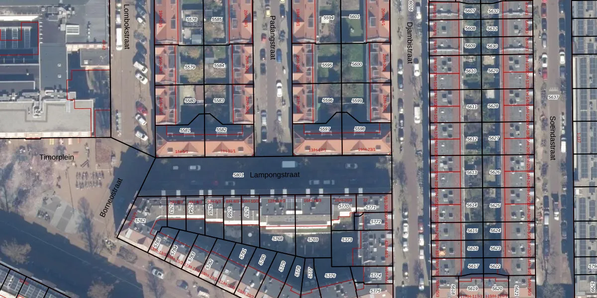 Het perceel waarop Lampongstraat 13-1 staat heeft een oppervlakte van 187 m². Dit is een middelgroot perceel. De perceeloppervlakte wordt geregistreerd door het Kadaster. Gedetailleerde informatie over de maten van dit perceel kunt u vinden in het rapport Kadastrale kaart met maatvoering van Lampongstraat 13-1.