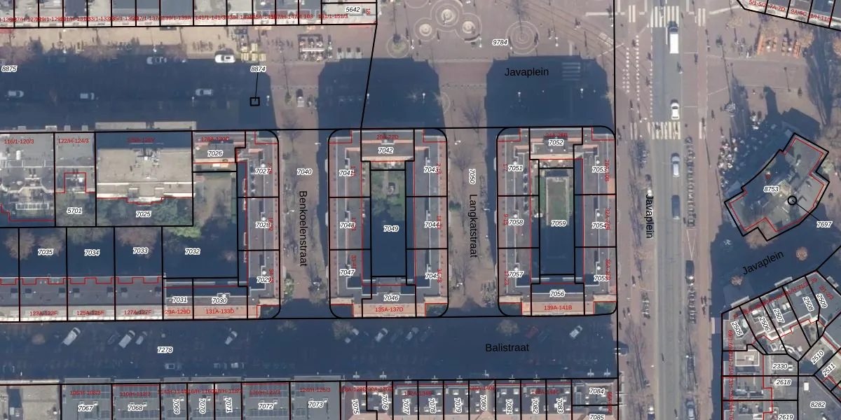 Het adres ligt op het perceel ASD15-S-7044, dat zich in de kadastrale gemeente Amsterdam bevindt. Het perceel is kleiner dan gemiddeld in Amsterdam. Het perceel is 125 m² groot, terwijl het gemiddelde ligt op 537,06 m². De grootste perceeloppervlakte in de kadastrale gemeente is 14,5 ha. De kleinste oppervlakte bedraagt 0 m². Op het perceel zijn 8 adressen aanwezig. De huidige grenzen van het perceel zijn digitaal in de Basisregistratie Kadaster (BRK) geregistreerd op 20-10-2006.