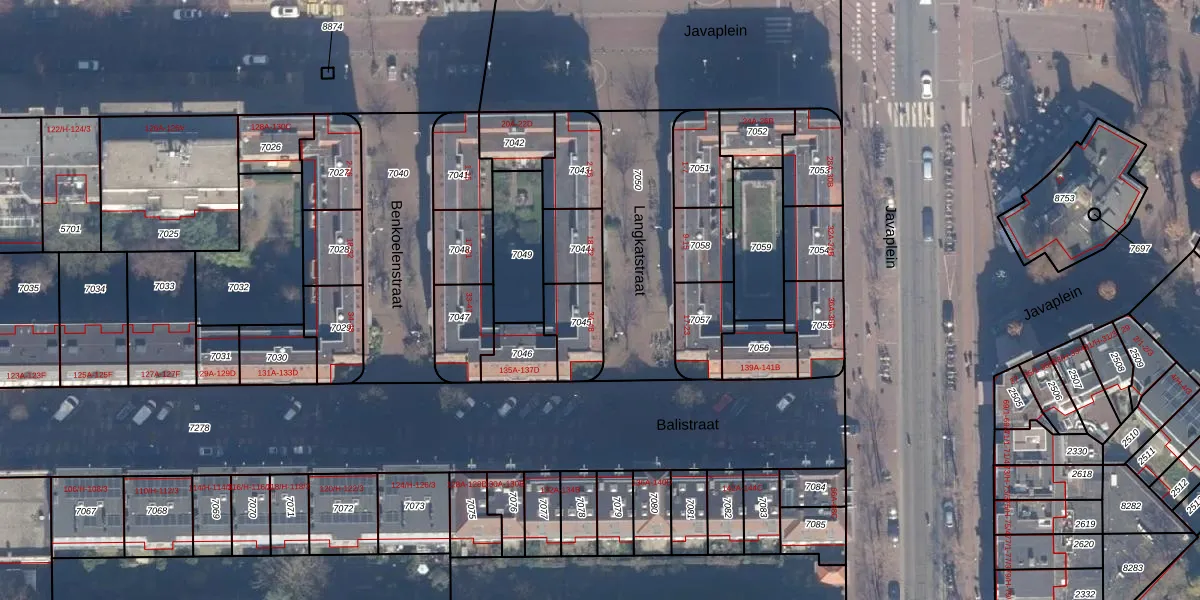 Het adres ligt op het perceel ASD15-S-7045, dat zich in de kadastrale gemeente Amsterdam bevindt. Het perceel is kleiner dan gemiddeld in Amsterdam. Het perceel is 141 m² groot, terwijl het gemiddelde ligt op 537,06 m². De grootste perceeloppervlakte in de kadastrale gemeente is 14,5 ha. De kleinste oppervlakte bedraagt 0 m². Op het perceel liggen in totaal 8 adressen. In de Basisregistratie Kadaster (BRK) werden de grenzen van het perceel geregistreerd op 20-10-2006.