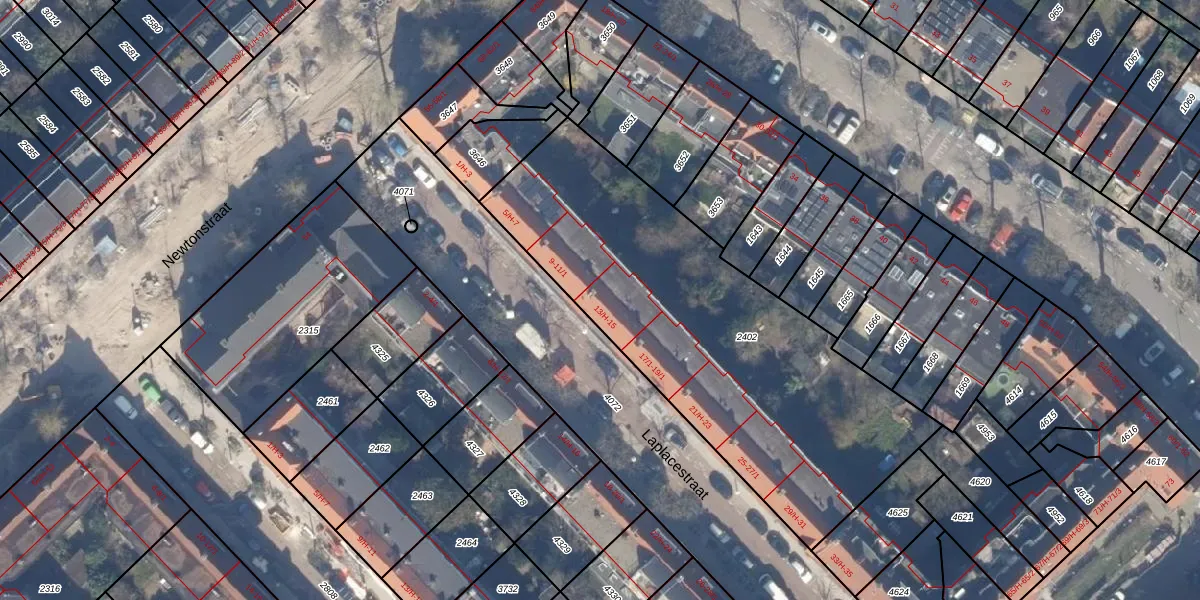 Het perceel waarop Laplacestraat 13-H staat heeft een oppervlakte van 1982 m². Dit is een zeer groot perceel. De perceeloppervlakte wordt geregistreerd door het Kadaster. Gedetailleerde informatie over de maten van dit perceel kunt u vinden in het rapport Kadastrale kaart met maatvoering van Laplacestraat 13-H.