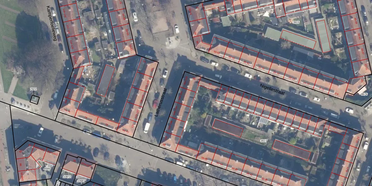 Het perceel waarop Latherusstraat 148 staat heeft een oppervlakte van 4342 m². Dit is een zeer groot perceel. De perceeloppervlakte wordt geregistreerd door het Kadaster. Gedetailleerde informatie over de maten van dit perceel kunt u vinden in het rapport Kadastrale kaart met maatvoering van Latherusstraat 148.