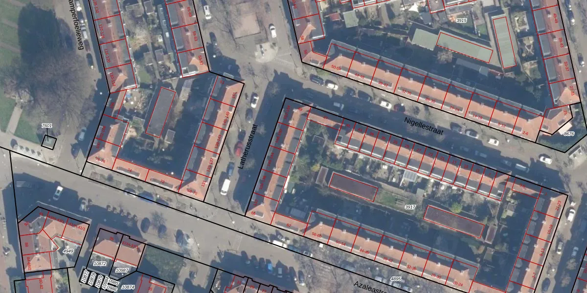 Het perceel waarop Latherusstraat 150 staat heeft een oppervlakte van 4342 m². Dit is een zeer groot perceel. De perceeloppervlakte wordt geregistreerd door het Kadaster. Gedetailleerde informatie over de maten van dit perceel kunt u vinden in het rapport Kadastrale kaart met maatvoering van Latherusstraat 150.