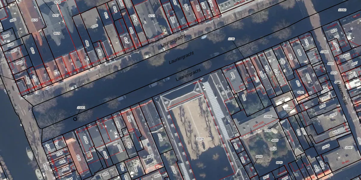 Het perceel waarop Lauriergracht 103-A staat heeft een oppervlakte van 2815 m². Dit is een zeer groot perceel. De perceeloppervlakte wordt geregistreerd door het Kadaster. Gedetailleerde informatie over de maten van dit perceel kunt u vinden in het rapport Kadastrale kaart met maatvoering van Lauriergracht 103-A.