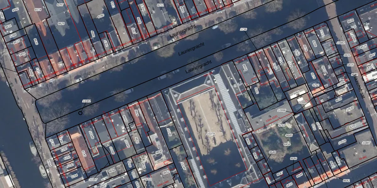 Het perceel waarop Lauriergracht 103-M staat heeft een oppervlakte van 2815 m². Dit is een zeer groot perceel. De perceeloppervlakte wordt geregistreerd door het Kadaster. Gedetailleerde informatie over de maten van dit perceel kunt u vinden in het rapport Kadastrale kaart met maatvoering van Lauriergracht 103-M.