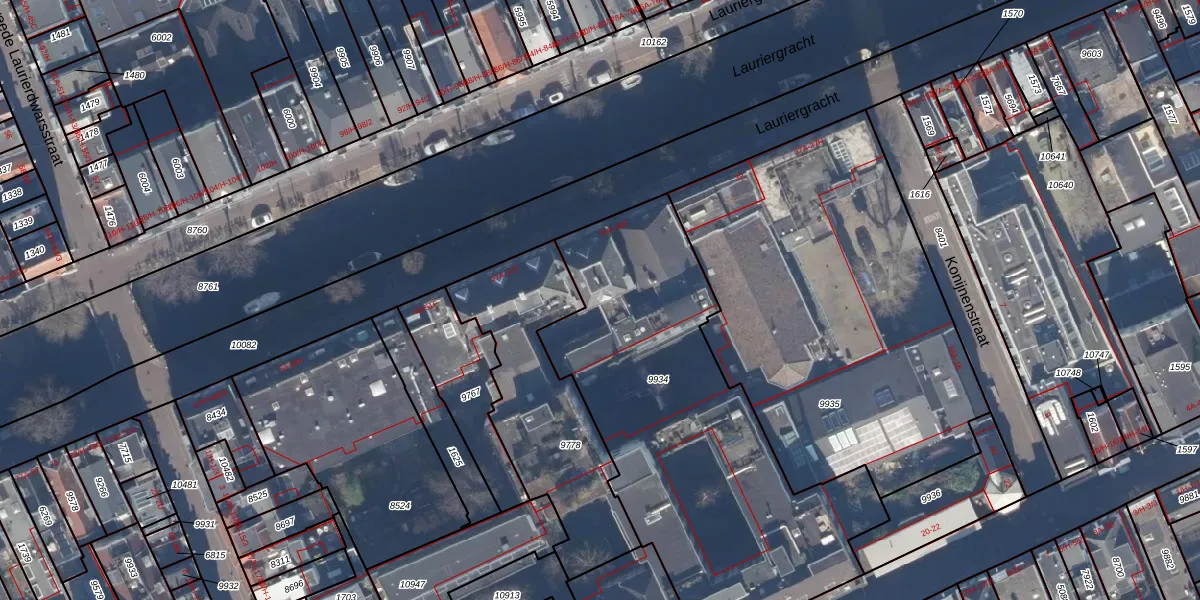 Het perceel waarop Lauriergracht 45-D staat heeft een oppervlakte van 1985 m². Dit is een zeer groot perceel. De perceeloppervlakte wordt geregistreerd door het Kadaster. Gedetailleerde informatie over de maten van dit perceel kunt u vinden in het rapport Kadastrale kaart met maatvoering van Lauriergracht 45-D.