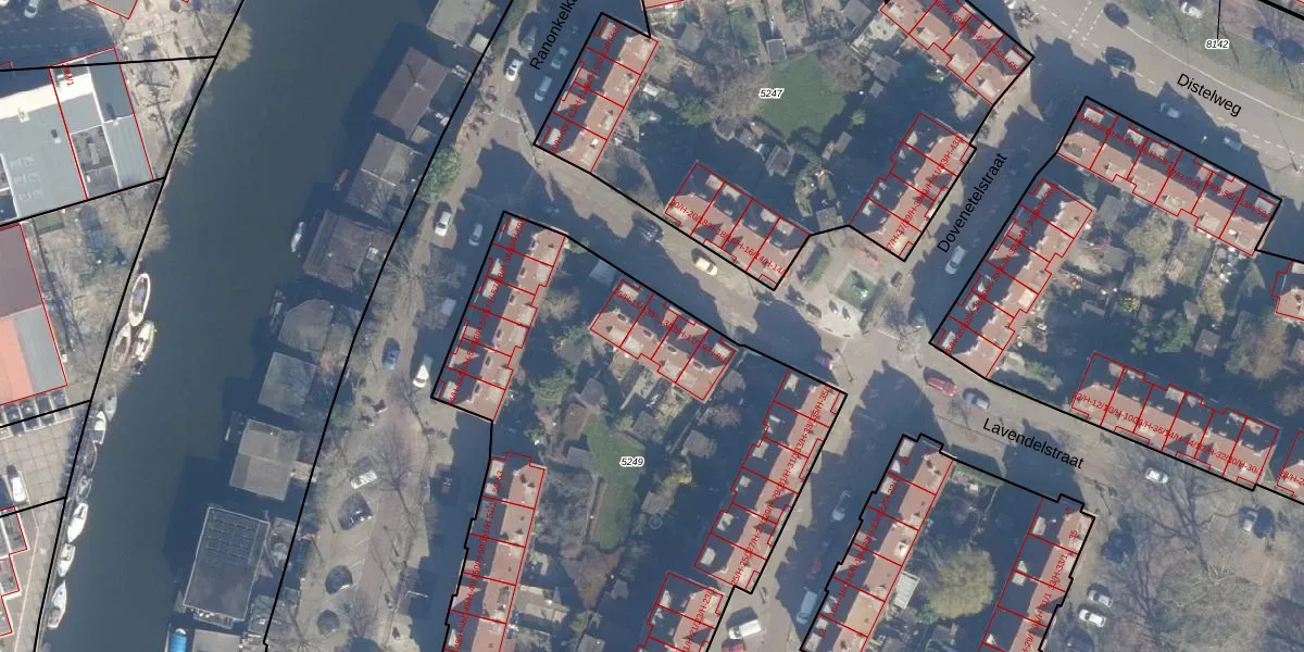 Lavendelstraat 13-H is gelegen op kadastraal perceel ASD07K5249. Deze kadastrale aanduiding is uniek en wordt gebruikt door het Kadaster om eigendomsrechten en andere zakelijke rechten vast te leggen. Het perceel maakt onderdeel uit van de kadastrale gemeente Amsterdam.