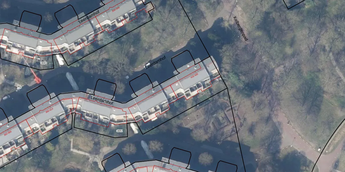 Leerdamhof 415 is gelegen op kadastraal perceel WPK02L3841. Deze kadastrale aanduiding is uniek en wordt gebruikt door het Kadaster om eigendomsrechten en andere zakelijke rechten vast te leggen. Het perceel maakt onderdeel uit van de kadastrale gemeente Weesperkarspel.