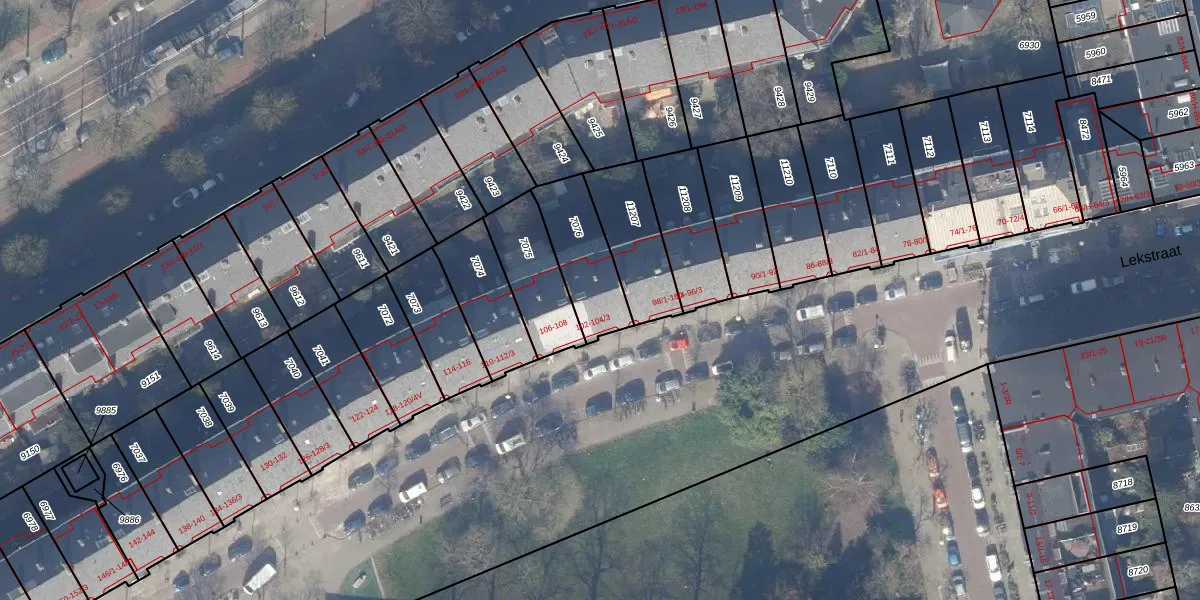 Lekstraat 102 is gelegen op kadastraal perceel ASD18V7076. Deze kadastrale aanduiding is uniek en wordt gebruikt door het Kadaster om eigendomsrechten en andere zakelijke rechten vast te leggen. Het perceel maakt onderdeel uit van de kadastrale gemeente Amsterdam.