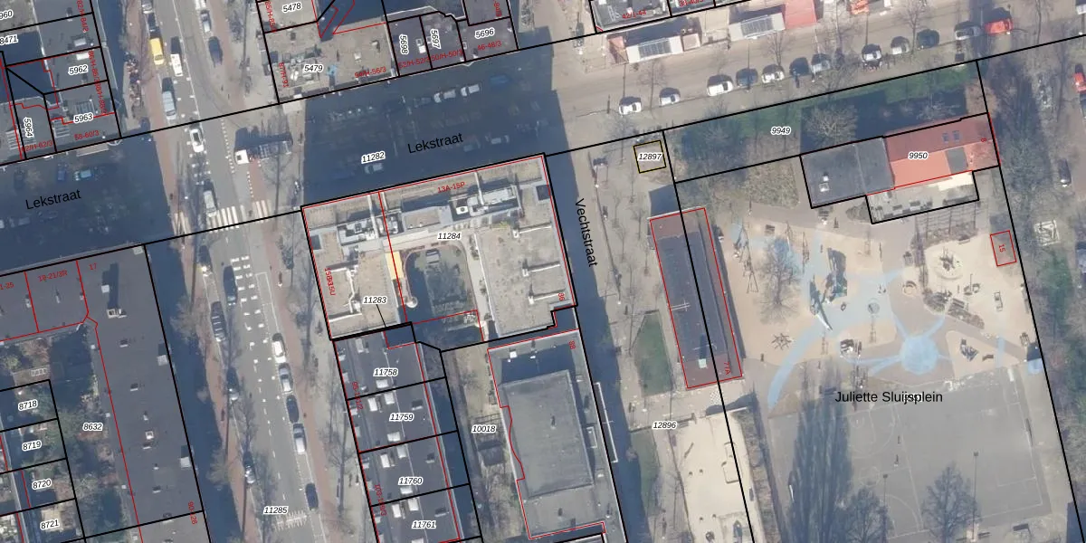 Lekstraat 13-E is gelegen op kadastraal perceel ASD18V11284. Deze kadastrale aanduiding is uniek en wordt gebruikt door het Kadaster om eigendomsrechten en andere zakelijke rechten vast te leggen. Het perceel maakt onderdeel uit van de kadastrale gemeente Amsterdam.