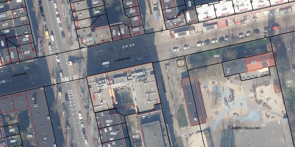 Lekstraat 13-F is gelegen op kadastraal perceel ASD18V11284. Deze kadastrale aanduiding is uniek en wordt gebruikt door het Kadaster om eigendomsrechten en andere zakelijke rechten vast te leggen. Het perceel maakt onderdeel uit van de kadastrale gemeente Amsterdam.
