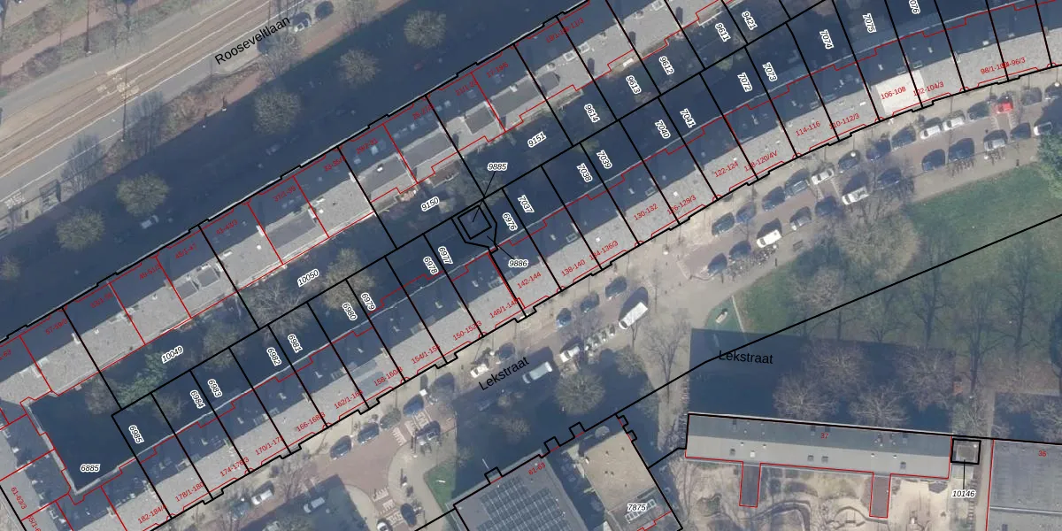 Lekstraat 142 is gelegen op kadastraal perceel ASD18V6976. Deze kadastrale aanduiding is uniek en wordt gebruikt door het Kadaster om eigendomsrechten en andere zakelijke rechten vast te leggen. Het perceel maakt onderdeel uit van de kadastrale gemeente Amsterdam.
