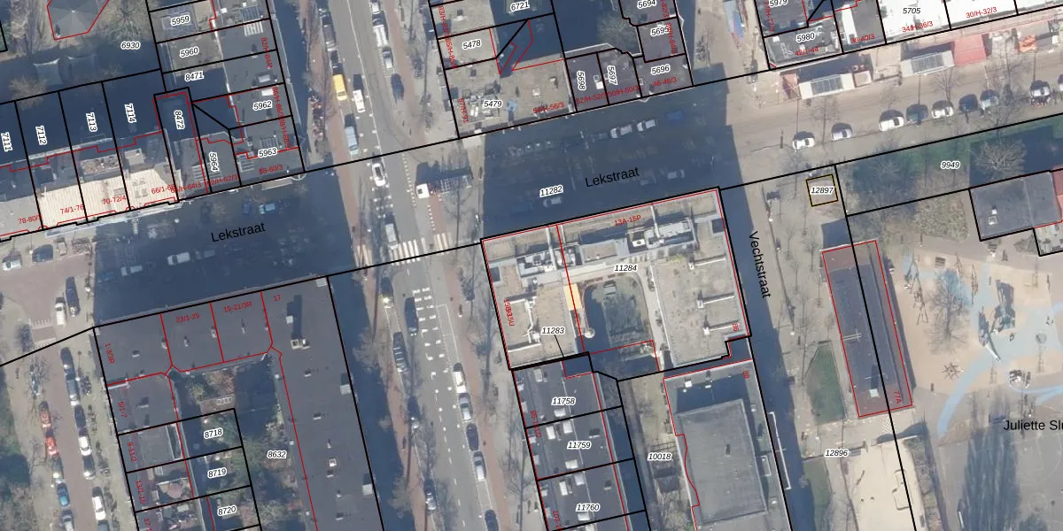 Lekstraat 15-L is gelegen op kadastraal perceel ASD18V11284. Deze kadastrale aanduiding is uniek en wordt gebruikt door het Kadaster om eigendomsrechten en andere zakelijke rechten vast te leggen. Het perceel maakt onderdeel uit van de kadastrale gemeente Amsterdam.