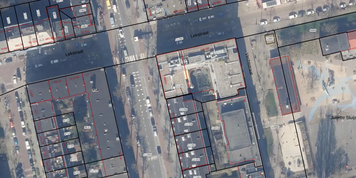 Lekstraat 15-T is gelegen op kadastraal perceel ASD18V11284. Deze kadastrale aanduiding is uniek en wordt gebruikt door het Kadaster om eigendomsrechten en andere zakelijke rechten vast te leggen. Het perceel maakt onderdeel uit van de kadastrale gemeente Amsterdam.