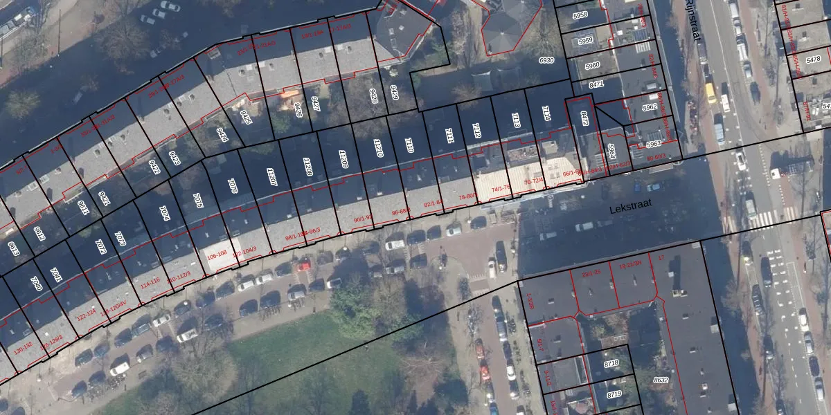 Lekstraat 84 is gelegen op kadastraal perceel ASD18V7110. Deze kadastrale aanduiding is uniek en wordt gebruikt door het Kadaster om eigendomsrechten en andere zakelijke rechten vast te leggen. Het perceel maakt onderdeel uit van de kadastrale gemeente Amsterdam.