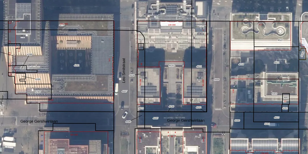 Het perceel waarop het adres ligt is ASD30-AK-4935. De afkorting 'ASD30' staat voor kadastrale gemeente Amsterdam. De oppervlakte van het perceel is 1837 m². Dat is groter dan gemiddeld in Amsterdam, waar de gemiddelde perceeloppervlakte op 1333,53 m² ligt. Het grootste perceel in de kadastrale gemeente is 22,2 ha. Het kleinste perceel heeft een oppervlakte van 0 m². Er zijn 131 adressen aanwezig op het perceel. In de Basisregistratie Kadaster (BRK) werden de grenzen van het perceel geregistreerd op 05-10-2021.