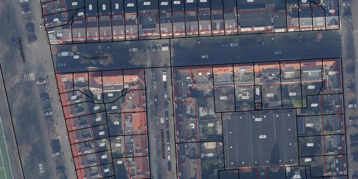 Het perceel waarop Leonardostraat 1-1 staat heeft een oppervlakte van 1040 m². Dit is een zeer groot perceel. De perceeloppervlakte wordt geregistreerd door het Kadaster. Gedetailleerde informatie over de maten van dit perceel kunt u vinden in het rapport Kadastrale kaart met maatvoering van Leonardostraat 1-1.