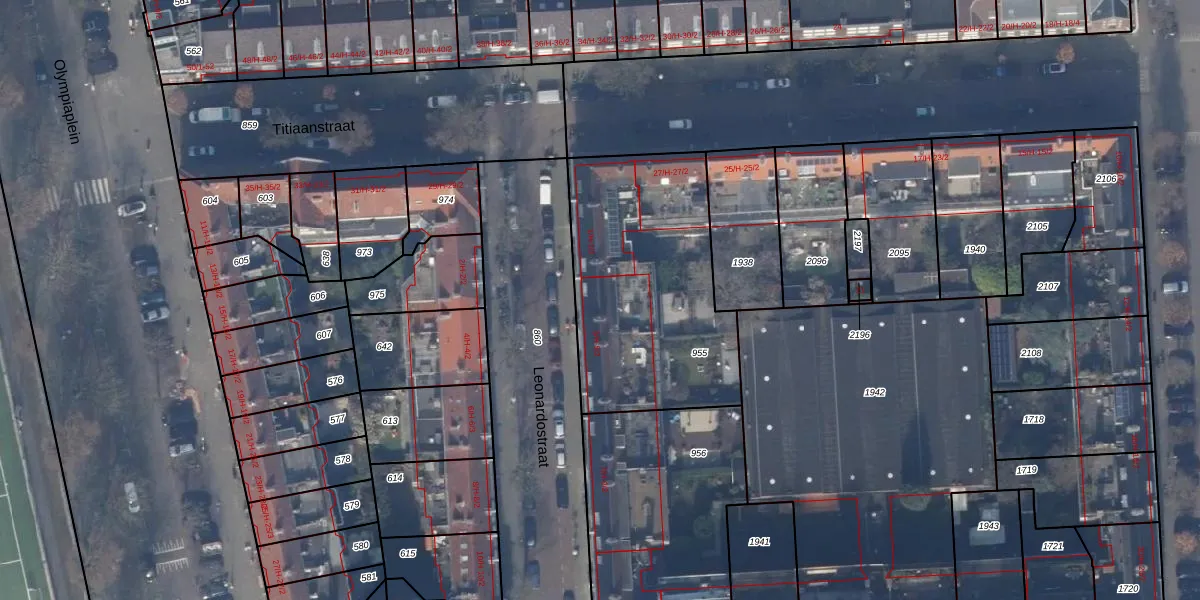 Het perceel waarop Leonardostraat 3-2 staat heeft een oppervlakte van 1040 m². Dit is een zeer groot perceel. De perceeloppervlakte wordt geregistreerd door het Kadaster. Gedetailleerde informatie over de maten van dit perceel kunt u vinden in het rapport Kadastrale kaart met maatvoering van Leonardostraat 3-2.