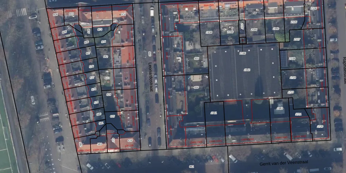 Het perceel waarop Leonardostraat 7-1 staat heeft een oppervlakte van 1040 m². Dit is een zeer groot perceel. De perceeloppervlakte wordt geregistreerd door het Kadaster. Gedetailleerde informatie over de maten van dit perceel kunt u vinden in het rapport Kadastrale kaart met maatvoering van Leonardostraat 7-1.