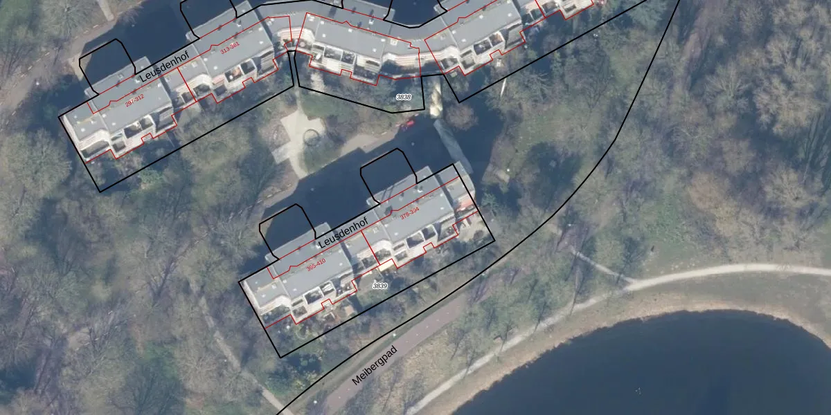 Het perceel waarop Leusdenhof 385 staat heeft een oppervlakte van 1455 m². Dit is een zeer groot perceel. De perceeloppervlakte wordt geregistreerd door het Kadaster. Gedetailleerde informatie over de maten van dit perceel kunt u vinden in het rapport Kadastrale kaart met maatvoering van Leusdenhof 385.