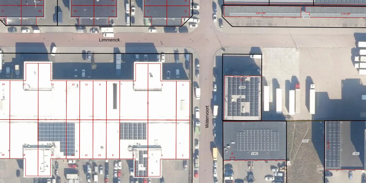 Het perceel waarop Limmerick 1 staat heeft een oppervlakte van 7830 m². Dit is een zeer groot perceel. De perceeloppervlakte wordt geregistreerd door het Kadaster. Gedetailleerde informatie over de maten van dit perceel kunt u vinden in het rapport Kadastrale kaart met maatvoering van Limmerick 1.