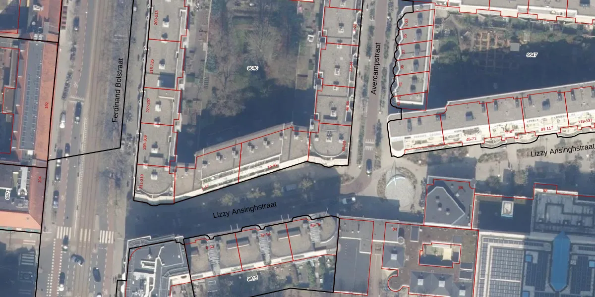 Lizzy Ansinghstraat 39 is gelegen op kadastraal perceel ASD18V9646. Deze kadastrale aanduiding is uniek en wordt gebruikt door het Kadaster om eigendomsrechten en andere zakelijke rechten vast te leggen. Het perceel maakt onderdeel uit van de kadastrale gemeente Amsterdam.