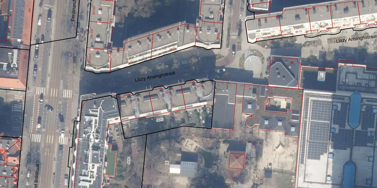 Lizzy Ansinghstraat 56 is gelegen op kadastraal perceel ASD18V9645. Deze kadastrale aanduiding is uniek en wordt gebruikt door het Kadaster om eigendomsrechten en andere zakelijke rechten vast te leggen. Het perceel maakt onderdeel uit van de kadastrale gemeente Amsterdam.