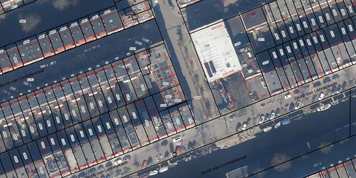 Het adres ligt op het perceel ASD16-T-6567, dat zich in de kadastrale gemeente Amsterdam bevindt. De gemiddelde perceelgrootte in Amsterdam is 245,33 m². Dit perceel is kleiner: de perceeloppervlakte bedraagt 169 m². De grootste perceeloppervlakte in de kadastrale gemeente is 3,3 ha. De kleinste oppervlakte bedraagt 0 m². Op het perceel zijn 5 adressen aanwezig. De laatste wijziging in het de Basisregistratie Kadaster (BRK) was op 01-07-2011.