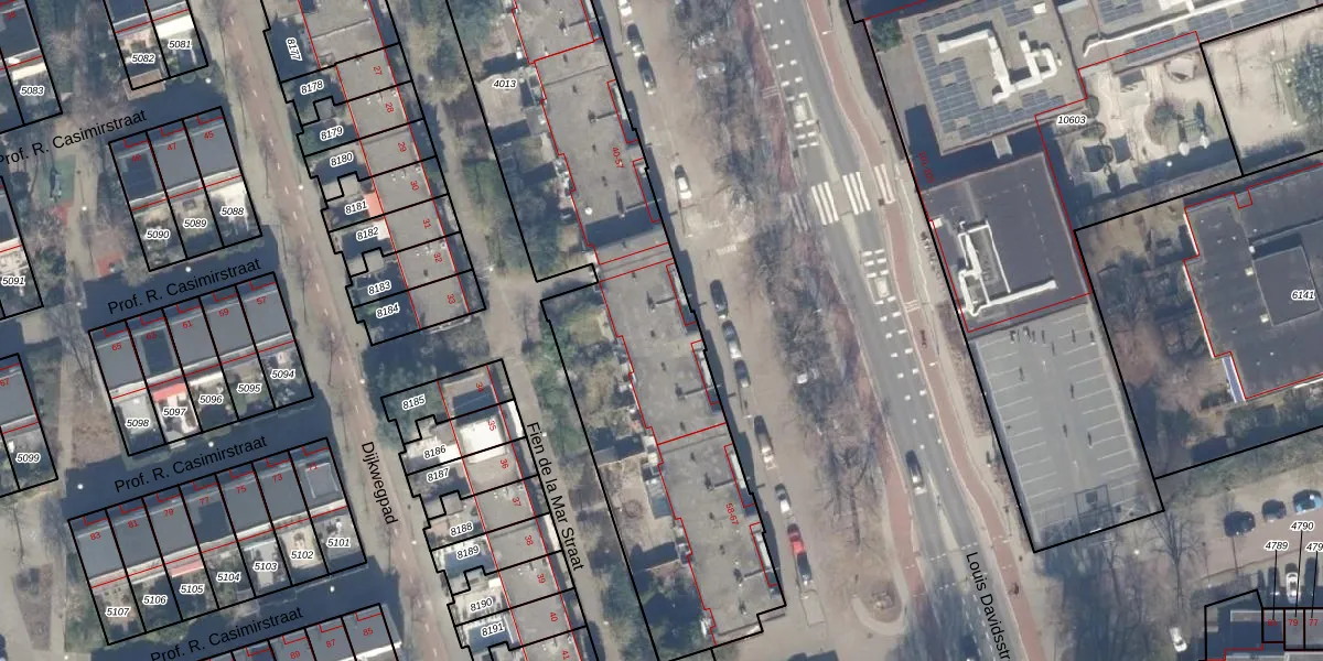 Het perceel waarop Louis Davidsstraat 49 staat heeft een oppervlakte van 4370 m². Dit is een zeer groot perceel. De perceeloppervlakte wordt geregistreerd door het Kadaster. Gedetailleerde informatie over de maten van dit perceel kunt u vinden in het rapport Kadastrale kaart met maatvoering van Louis Davidsstraat 49.