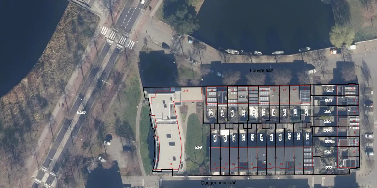 Het perceel waarop Louvrelaan 28 staat heeft een oppervlakte van 1372 m². Dit is een zeer groot perceel. De perceeloppervlakte wordt geregistreerd door het Kadaster. Gedetailleerde informatie over de maten van dit perceel kunt u vinden in het rapport Kadastrale kaart met maatvoering van Louvrelaan 28.